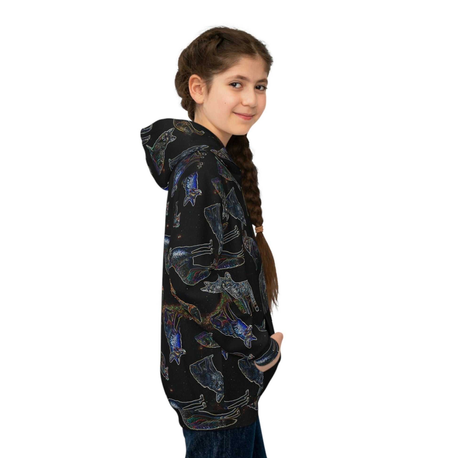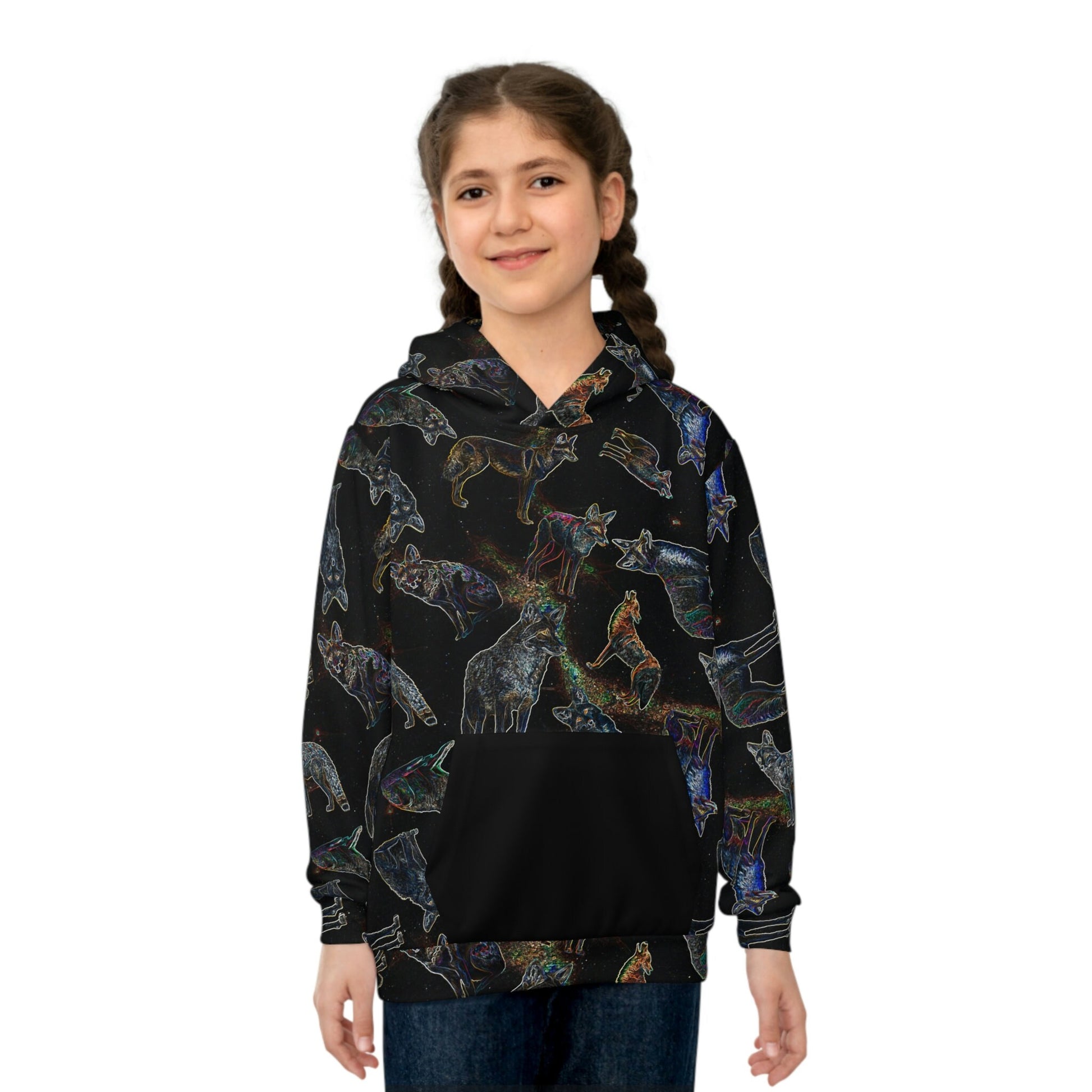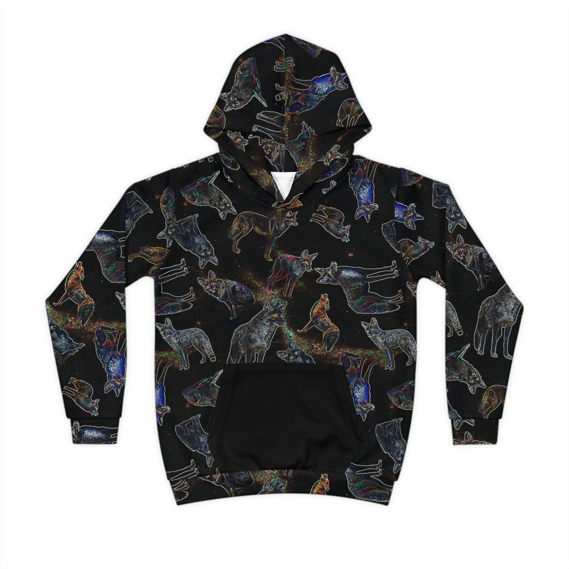 Coyote Galaxy, Children's fashion, Hoodie, Stylish pattern, High-quality material, Comfortable fit, Breathable fabric, space inspired, black