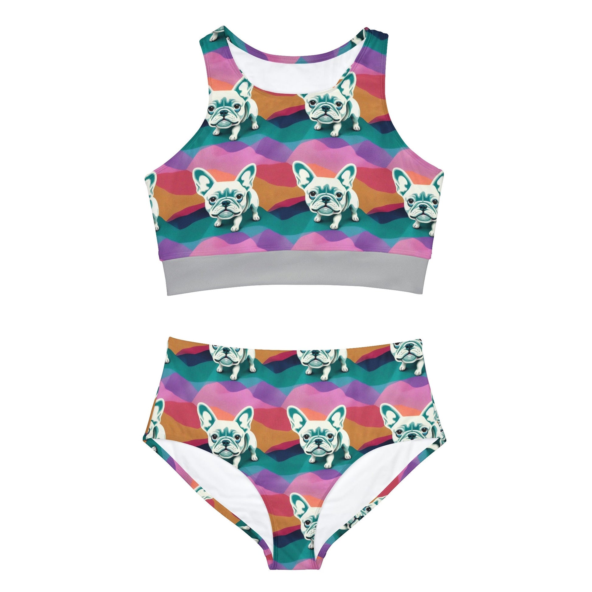 French Bulldog High Waisted Bikini Set, Dog Print Plus Size Sporty Bikini, Two Piece Girls Sexy Bikini Set, Summer Clothing