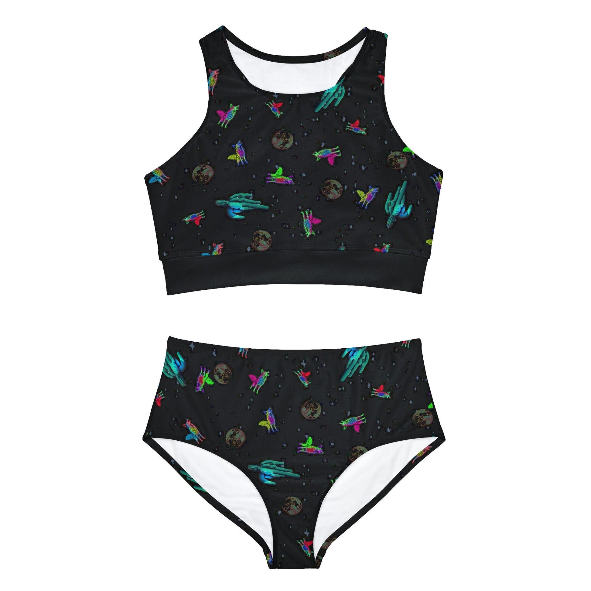 Space Print High Waisted Bikini Set, Coyote Sporty Bikini Set, Girls Summer Bikini, Two Piece Set Gift For Women
