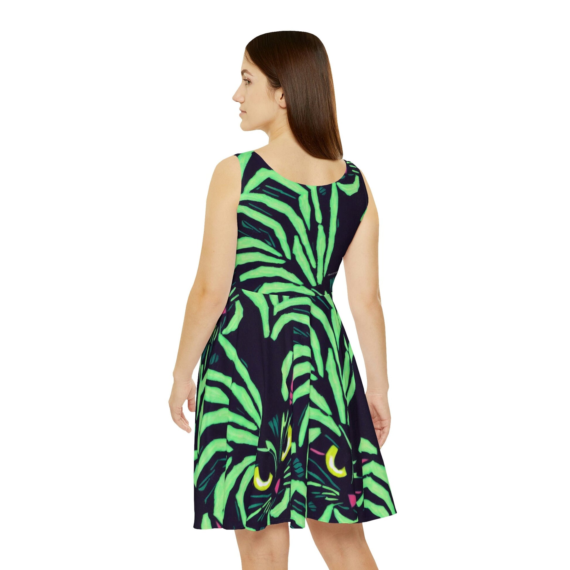 Yellow Eyed Cat Skater Dress, Green Pattern Sleeveless Dress, Spooky Cat Skater Dress for Women, Handmade Mini Skater Dress
